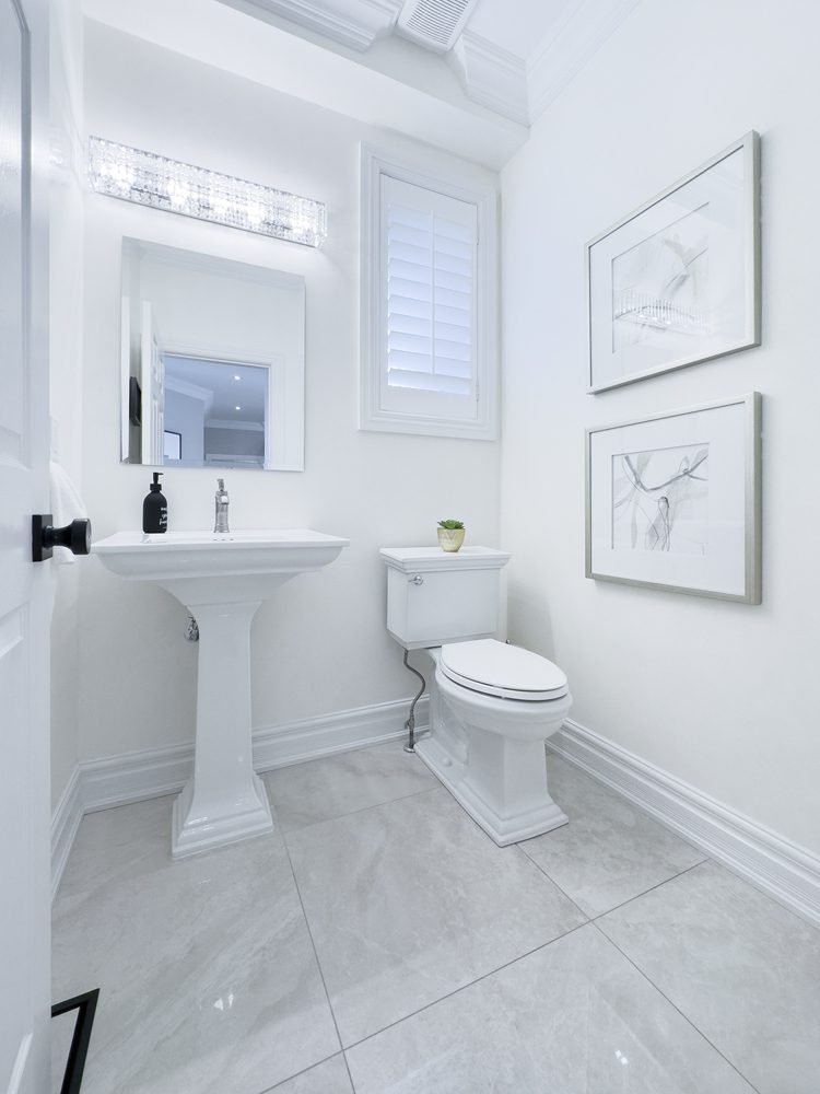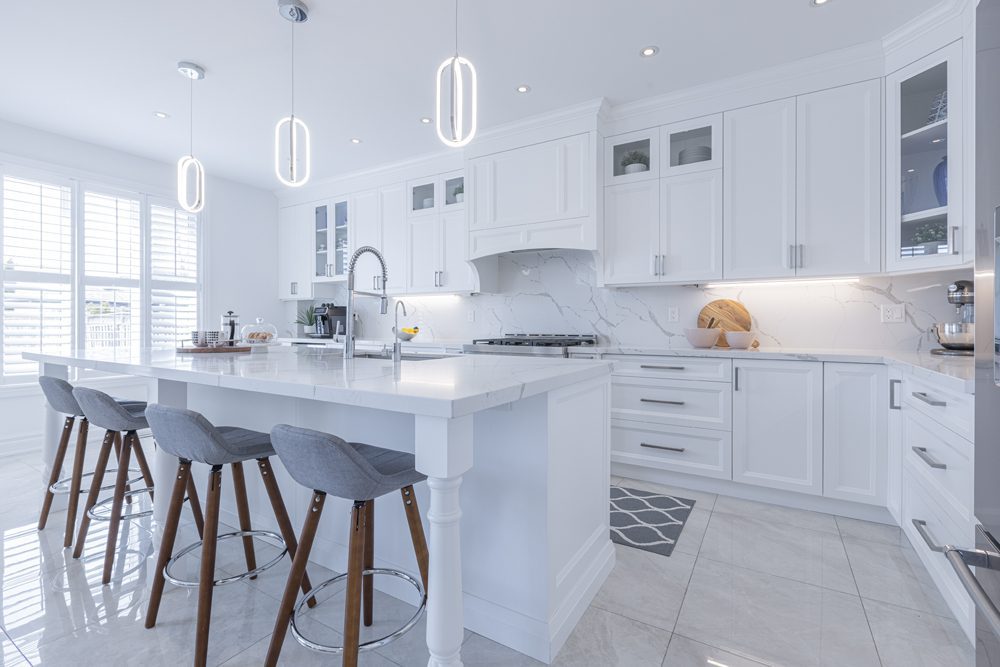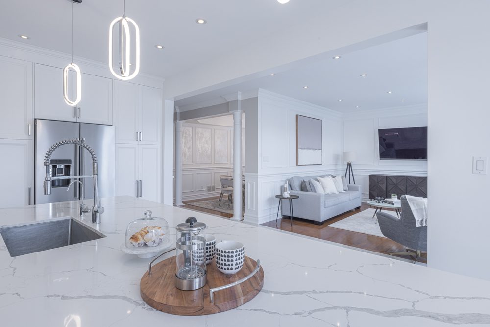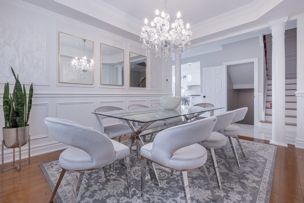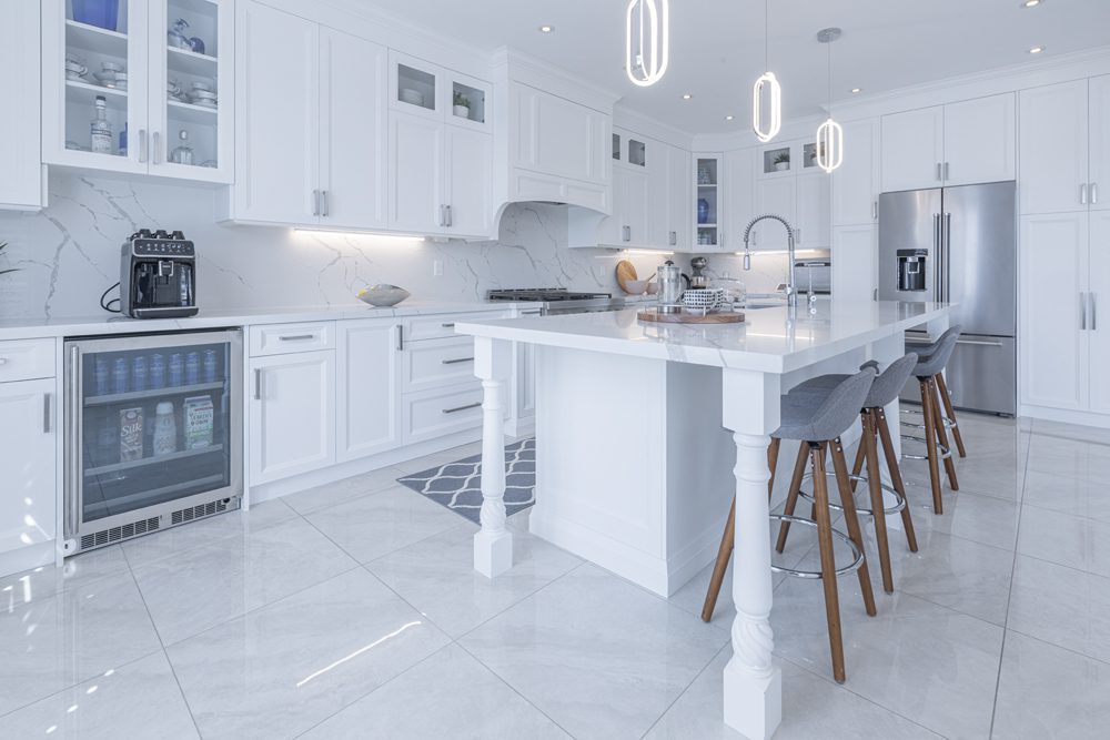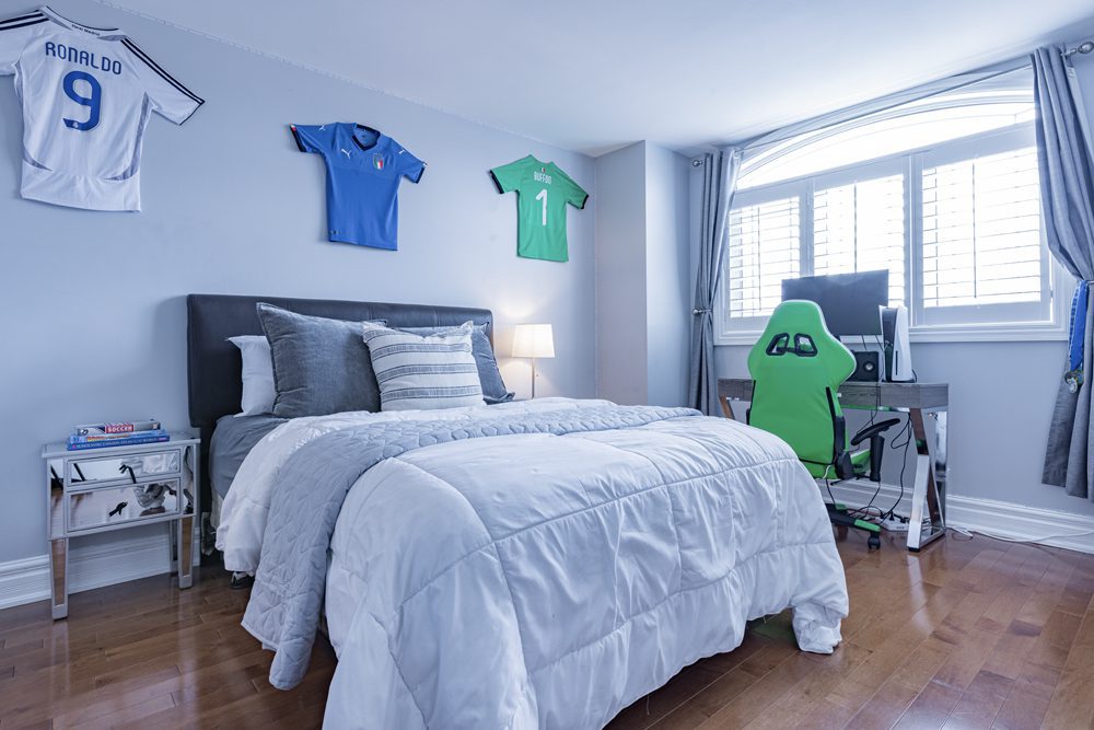 Inside and you’ll be greeted by a spacious main floor den, perfect for a home office or study area. The open concept living and dining area is filled with natural light, while the show-stopping custom gourmet kitchen is a true chef’s paradise. Boasting top-of-the-line appliances, Calcutta quartz countertops, and ample storage space, this kitchen is the heart of the home.
