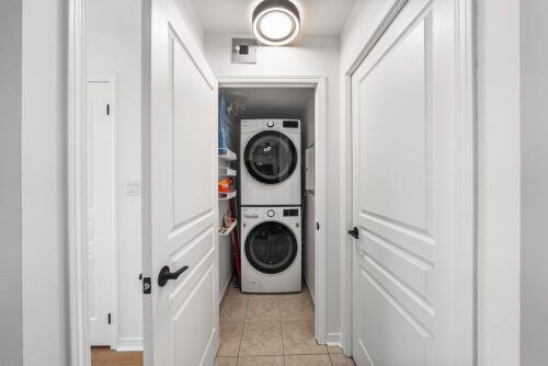 The bathroom has been updated with a new counter and sink, and the suite is finished with new light fixtures and updated door hardware throughout. For convenience, there is in-suite laundry with a washer and dryer, all existing blinds are included, and the unit comes with one underground parking space and one locker. The condo is vacant and move-in ready, and some of the marketing photos will be virtually staged to help buyers visualize how the rooms can be furnished.